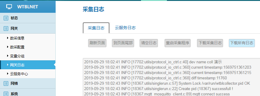 采集日志用于诊断网关采集现场设备的通信情况和报文收发情况、以及远程配置交互等情况。