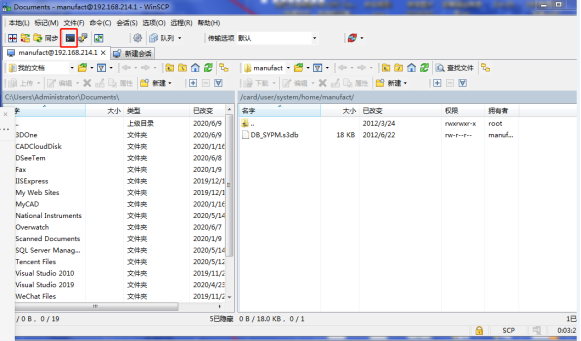 第二步:打开WinSCP软件,将文件协议配置为SCP,主机IP:192.168.214.1 端口号:22,用户名manufact,密码大写:SUNRISE。
