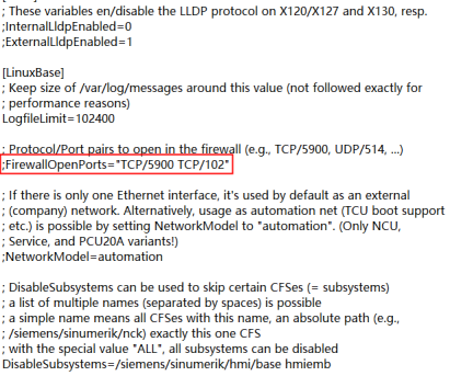 第四步:备份好后打开文件,找到;FirewallOpenPorts="TCP/5900 TCP/102"这一行,把前面的“;”分号删除,然后保存,把文件拖拽到右边CNC文件进行覆盖,覆盖过程中会出现权限不够(不用管),直接点OK。然后点击打开文件进行确认是否修改成功。