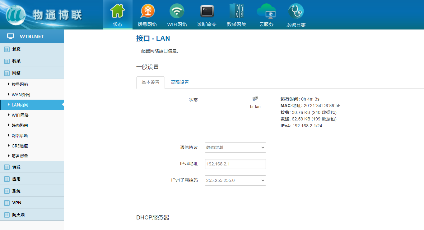 下载中心 视频中心 常见问题 售后服务 工业网关 设备快线 数据云平台 联网设备 问答百科 如何修改工业智能网关的LAN口IP地址? 时间:2022-10-26 09:06:09 点击:7601 关键词:工业智能网关,LAN口 问题:如何修改工业智能网关的LAN口IP地址? 回答: (1)电脑直连网关,确保电脑与网关处于同网段或者自动获取 浏览器里面输入192.168.2.1 (2)登陆网关配置界面 默认用户名/密码:admin/123456 (2)选择网络——Lan内网——更改IPV4地址、子网掩码,保存应用 (3)注意电脑本机IP地址是否与更改地址处于同网段(自动获取需重新拔 插网线) (4)浏览器输入更改后的IP地址登陆到网关配置界面即修改成功 上一篇:工业智能网关和DTU有什么区别吗? 下一篇: 工业智能网关需要另外配4G路由器吗?