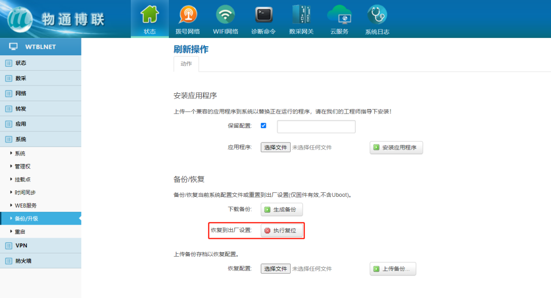 下载中心 视频中心 常见问题 售后服务 工业网关 设备快线 数据云平台 联网设备 问答百科 工业智能网关如何进行软硬件复位? 时间:2022-10-26 09:13:38 点击:8330 关键词:工业智能网关,网关复位,网关重启 问题:工业智能网关如何进行软硬件复位? 回答: (1)硬件复位 第一时间断电后再通电重启设备网关,当网关指示灯STATUS和WARN交替闪烁后,立即长按RESET键,直到ERROR灯慢闪后松开(或3秒后松开),再次长按RESET键,直到ERROR灯快闪后松开按钮(或3秒后松开),网关开始复位 (2)软件复位 系统——备份/升级——恢复到出厂设置 上一篇:工业智能网关如何设置静态固定IP? 下一篇: 工业智能网关和DTU有什么区别吗?