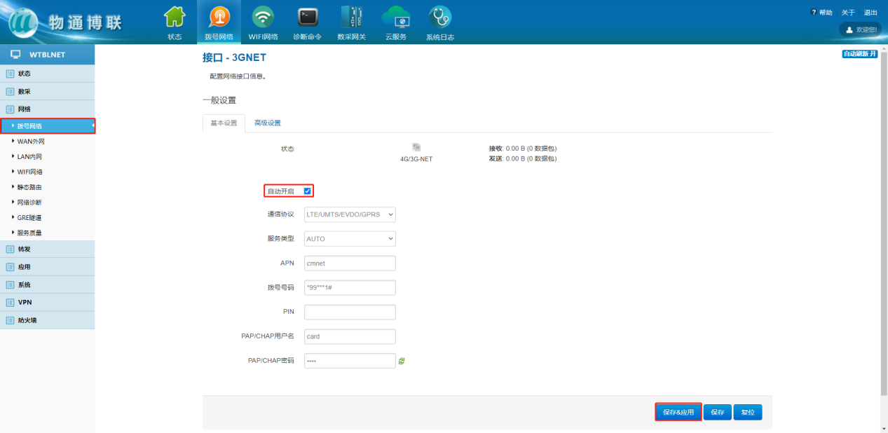 下载中心 视频中心 常见问题 售后服务 工业网关 设备快线 数据云平台 联网设备 问答百科 工业智能网关如何使用流量卡上网? 时间:2022-10-26 09:15:30 点击:7414 关键词:工业网关,流量卡,网关配置 问题:工业智能网关如何使用流量卡上网? 回答: (1)电脑顺利获得网线接入到网关LAN口,浏览器输入192.168.2.1默认地址 (2)登陆到网关配置界面,点击网络—拨号网络—自动开启—保存应用 上一篇:工业智能网关如何连接wifi热点? 下一篇: 工业智能网关如何使用网线上网?