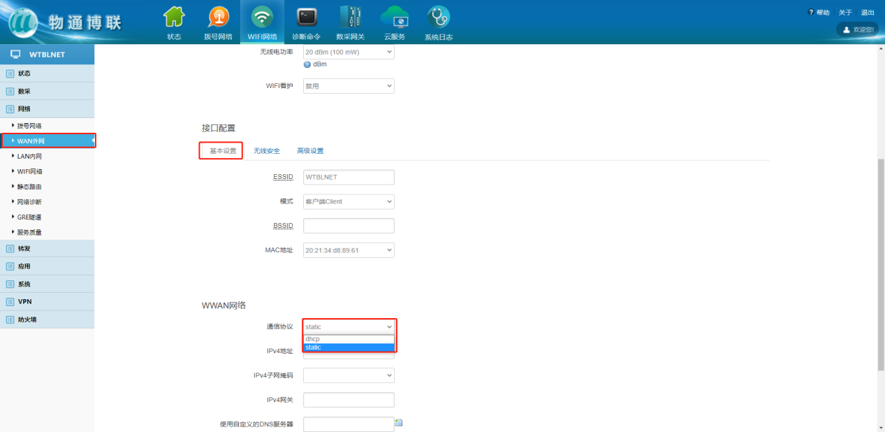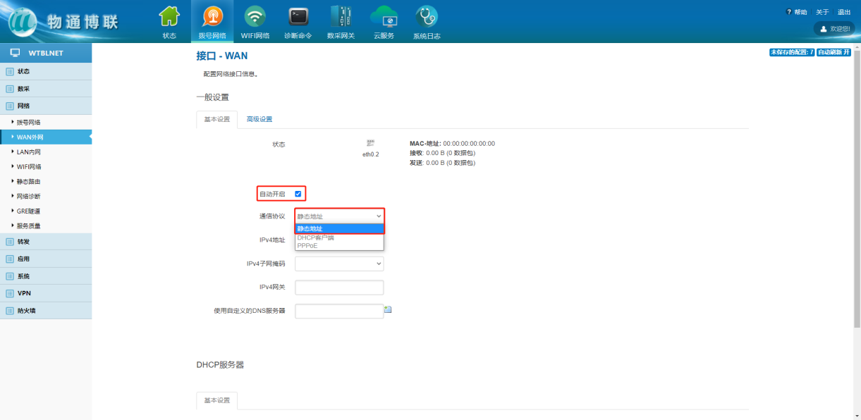 下载中心 视频中心 常见问题 售后服务 工业网关 设备快线 数据云平台 联网设备 问答百科 工业智能网关如何设置静态固定IP? 时间:2022-10-26 09:15:30 点击:7641 关键词:工业智能网关,静态固定IP,网关配置 问题:工业智能网关如何设置静态固定IP? 回答: (1)WAN外网设置静态IP 网络—WAN外网—切换通信协议——填写固定IP参数 (2)WiFi网络设置静态IP 网络—WiFi网络—修改—切换通信协议—填写静态IP 上一篇:工业智能网关如何使用网线上网? 下一篇: 工业智能网关如何进行软硬件复位?