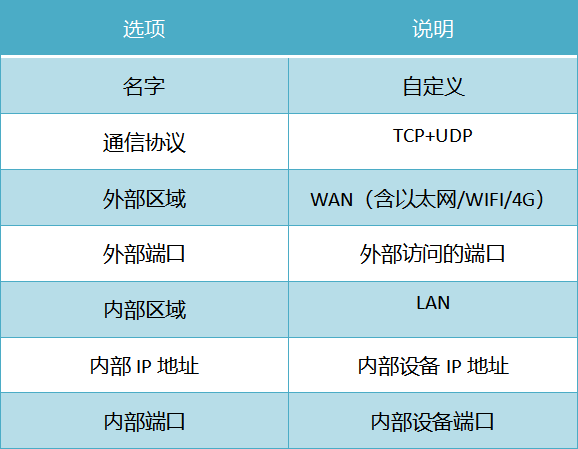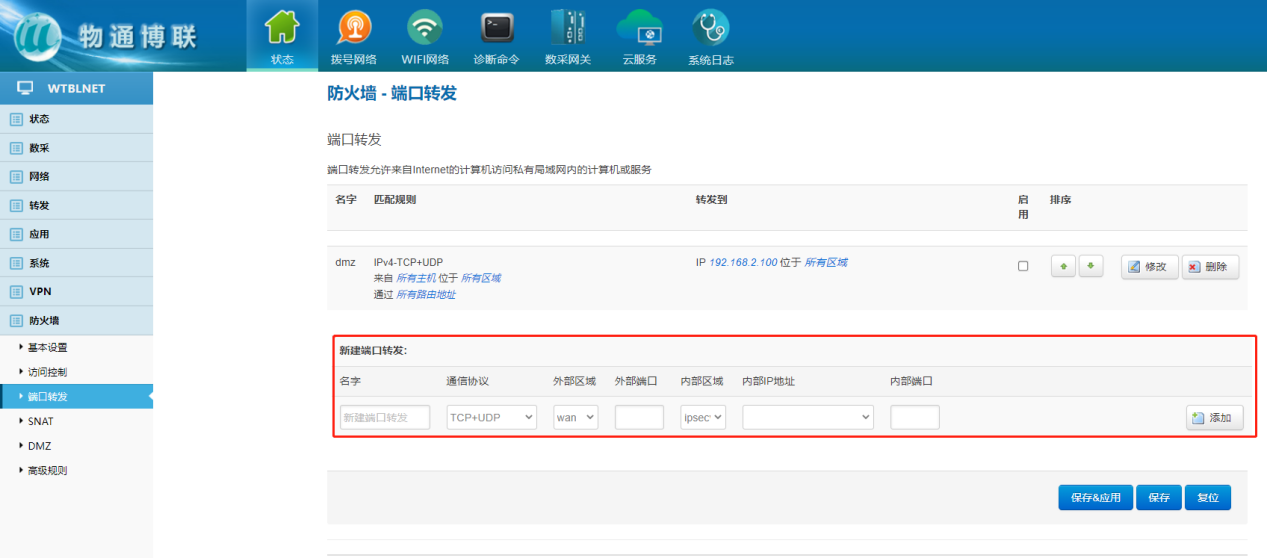 下载中心 视频中心 常见问题 售后服务 工业网关 设备快线 数据云平台 联网设备 问答百科 工业网关如何配置端口映射? 时间:2022-10-26 09:39:53 点击:7703 关键词:工业网关,网关配置,端口转发 问题:工业网关如何配置端口映射? 回答: 网关配置界面—防火墙—端口转发 端口转发允许来自Internet的计算机访问私有局域网内的计算机或服务 使用场景:端口转发是将发往外网的一个端口的通信完全转发给内网一个地址的指定端口 上一篇:如何顺利获得k豆kdpay钱包AI工业网关实现网口设备远程上下载? 下一篇: 工业智能网关支持的电压范围?