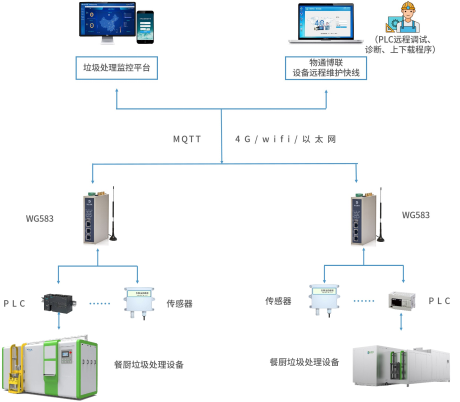 k豆kdpay钱包AI工业智能网关WG583与餐厨垃圾处理设备进行通讯,可以将设备的运行状态、工作参数等数据采集到网关上,进行解析并上报到云端。