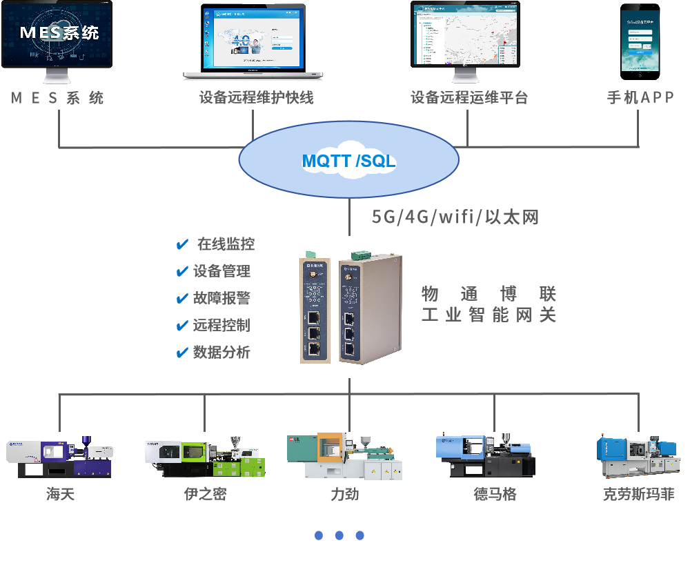 k豆kdpay钱包AI推出的工业智能网关能够接入弘讯、科强、恩格尔、住友、日精等注塑机控制器,从中采集注塑机运行状态、成型参数、工艺参数、报警信息等重要参数,对接到工厂MES系统、ERP系统中,从而实现各项数据的统计展示与管理分析,辅助生产管理、工艺管理、运维管理等工作高质量召开,有助于提高工作效率与管理水平,企业效益持续增长。